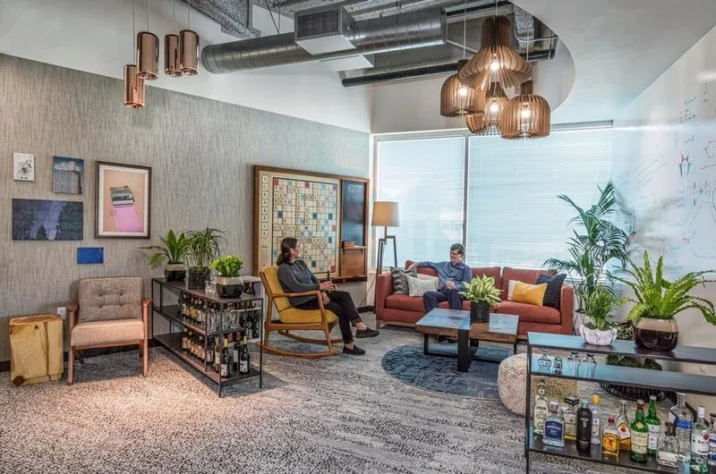 Indiewalls spearheaded the project from curation to installation, embracing the challenge to not only complement the office's aesthetic but also reflect Amazon's ethos and diversity. The project particularly focused on showcasing the works of local artists from the Arlington community, while drawing inspiration from the office’s surroundings for the artworks themselves. This dynamic art program is diverse both in its representation of artists and backgrounds and the array of artwork types, with large-scale murals, suspended sculptures, mixed media works, wall reliefs, and original paintings. Indiewalls' role in the project, which ran from July 2021 to May 2023, encompassed an extensive range of responsibilities. Beyond art curating, the company was also deeply involved in artist contracting, fabrication supervision, installation, and the overall management of the art program’s timeline and budget to the complete satisfaction of the client. Working closely with Amazon, Seneca Group, and design firms NBBJ and ZGF, Indiewalls curators and project managers were in constant communication throughout, addressing challenges creatively and coordinating schedules effectively. One of the most significant installations is Kirsten Hassenfeld’s “Cherry Smash.” Hovering over the check-in desks at the Event Center, this piece uses thousands of upcycled objects to form a floral cascade that questions how culture reshapes nature.