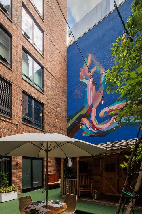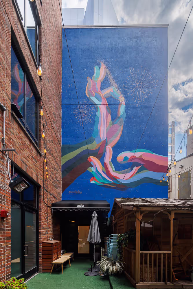 The Story: Indiewalls worked with NYC-based artists Finley and Jennifer Palomaa on two murals at ARLO SOHO. For the hotel’s courtyard, Finley created a large-scale mural interpretation of a Buddhist mudra hand gesture to instill the open air space–in the direct view of the hotel's Linden's restaurant and guest rooms–with a sense of serenity, color and compassion. Inside the hotel, Brooklyn-based artist Jennifer Palomaa created an immersive mural Inspired by the hotel’s seasonal theme, “Arlo Blooms” featuring larger-than-life tropical flora.