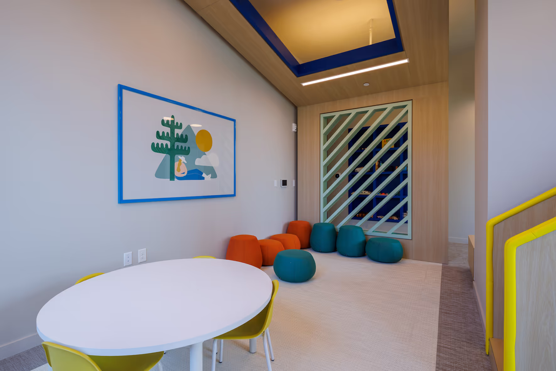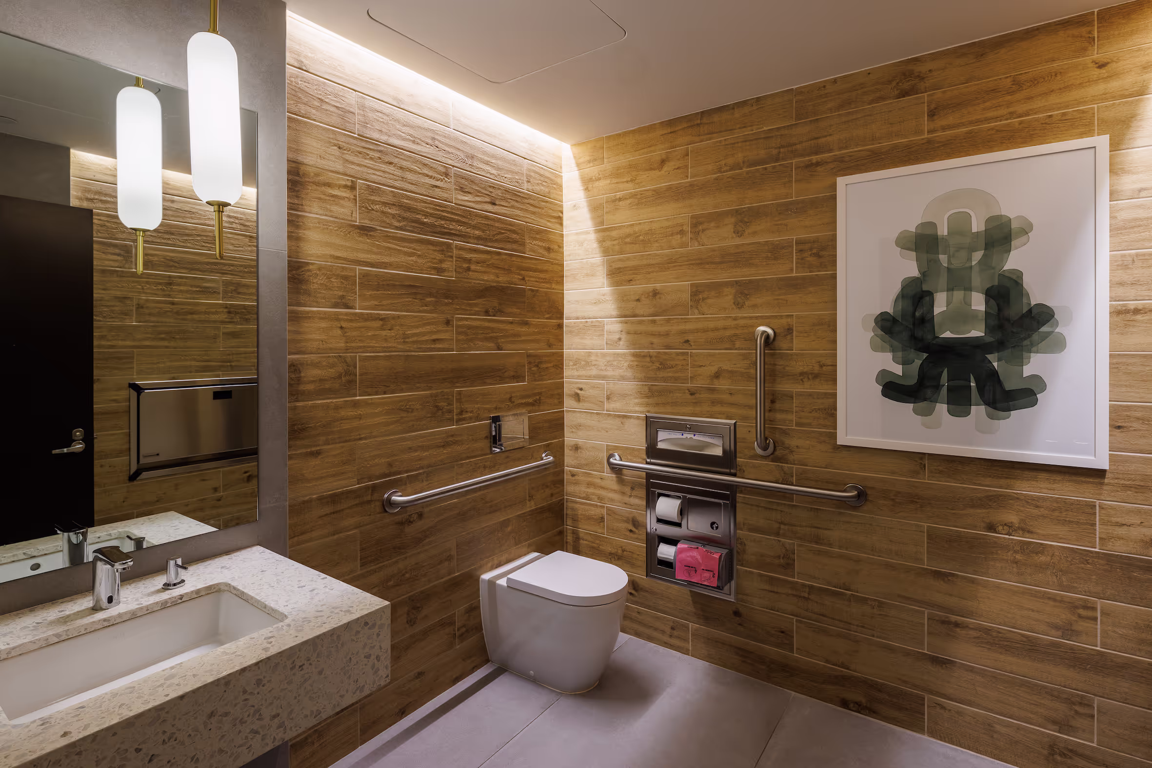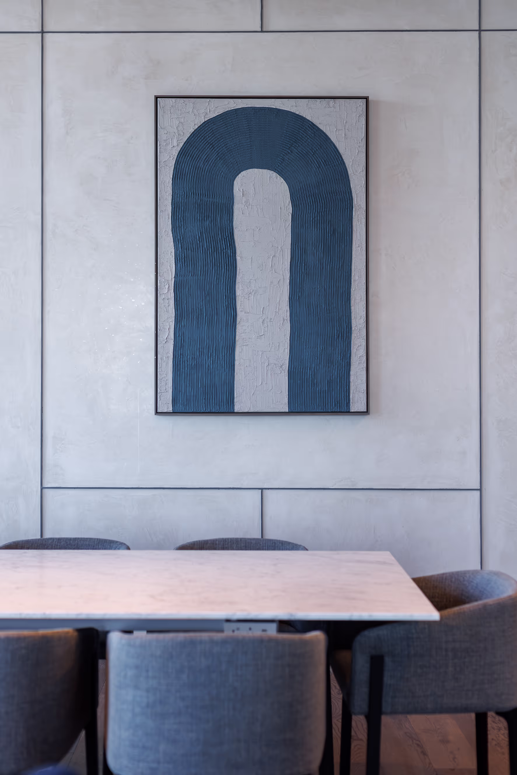 The art program at Haus 25 is an absolute reflection of New Jersey itself, embodying the state's unique blend of bucolic and bustling energy, charm, and culture. The art collection is carefully curated from scores of talented artists, capturing the very essence of the city's eclectic vibe and infusing the space with an undeniable sense of comfort and familiarity. Just like the vibrant community it serves, Haus 25's art collection is incredibly diverse, featuring an impressive range of mediums including photography, mixed media, paintings, textile art, and site-specific sculpture.