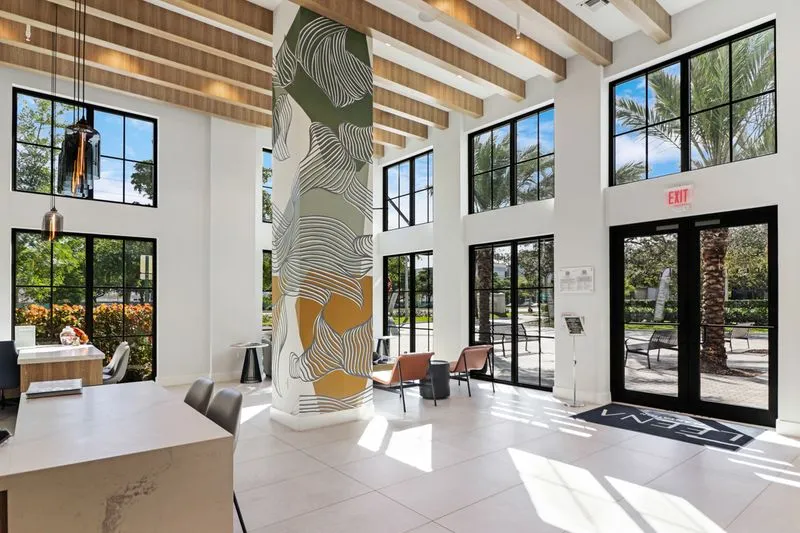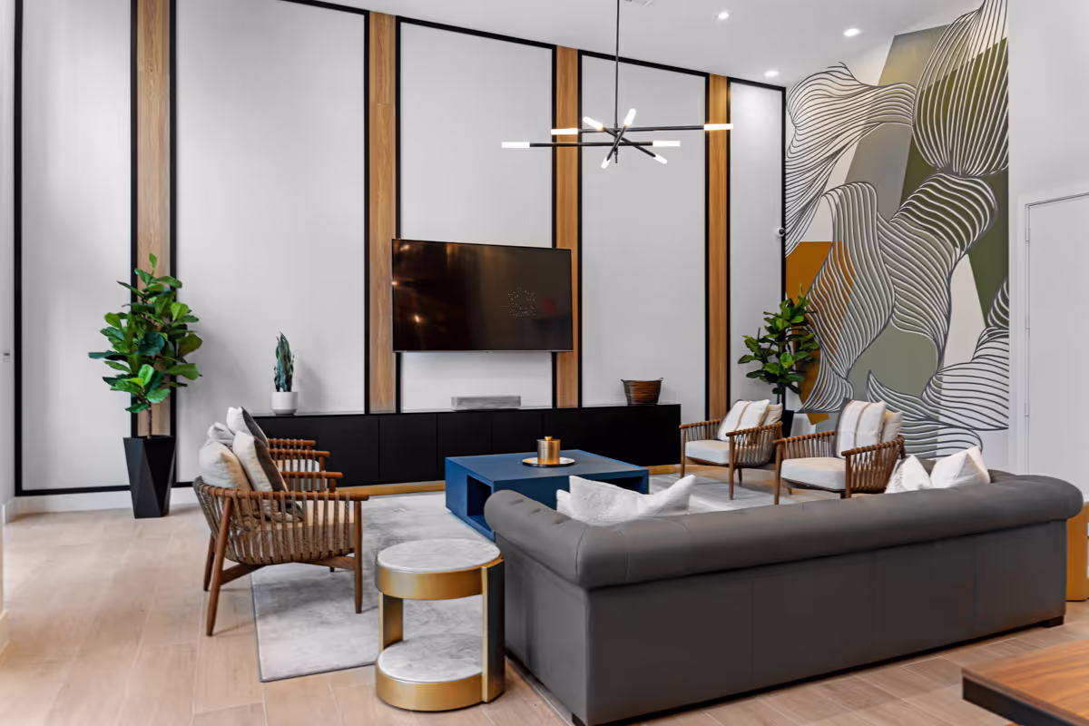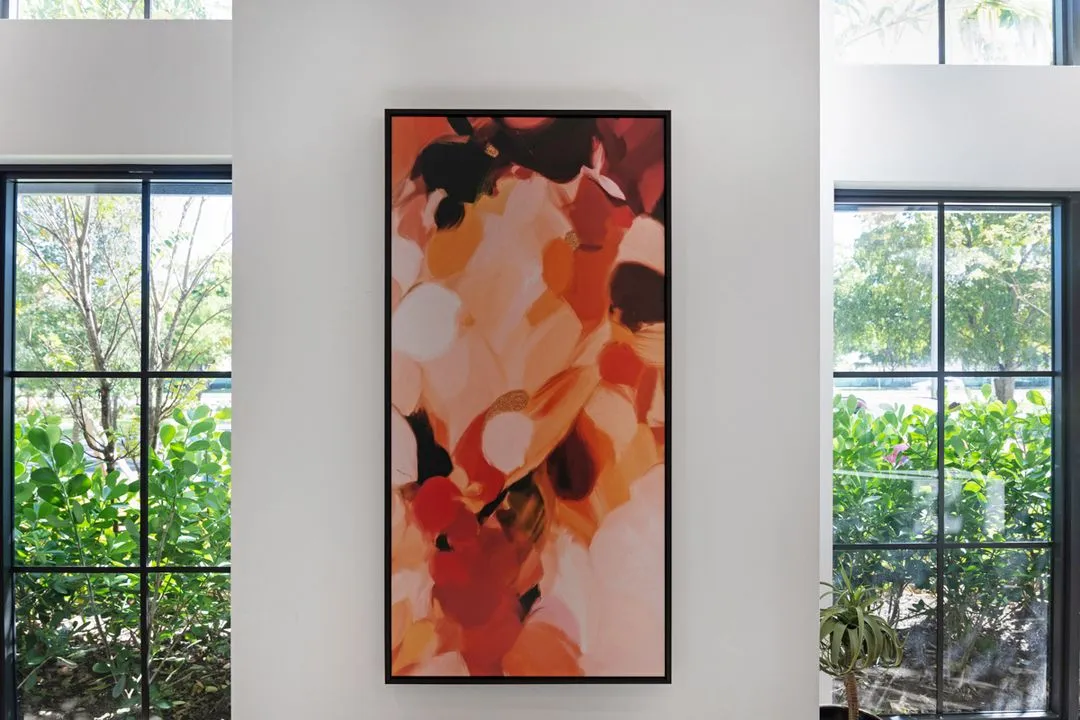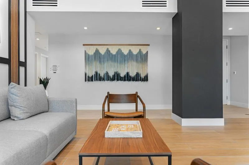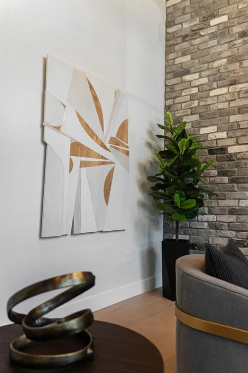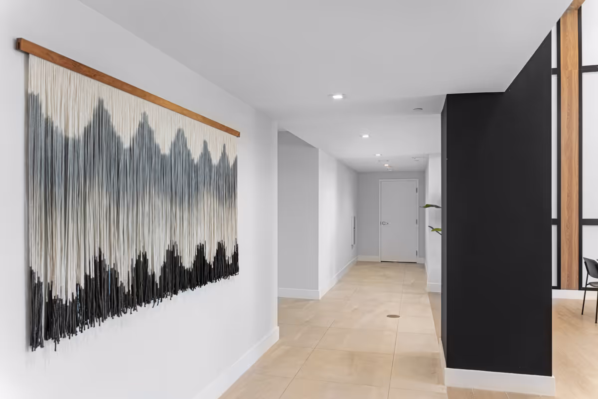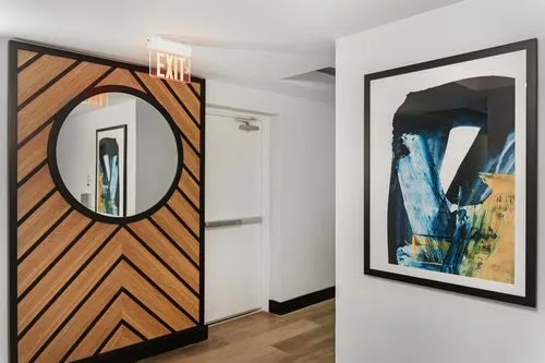 Indiewalls curated an art collection that mirrors the property's elegant, minimalistic, and tropical design. Located in South Florida, this collection features warm, earthy tones and diverse textures. It includes a range of media, such as hand-painted murals and hand-dyed textile art, highlighting the unique touch of each artist. Notable pieces include collaborations with local muralist Orla Ananda, resulting in two significant murals that reflect the local ambiance. Scott Troxel's "Eclipse," a wooden wall sculpture, skillfully blends warm wood shades with sleek ivory elements. Lauren Williams' "Blue Ridge" contributes texture and softness, utilizing fabric to enhance the verticality of the space. Completing the collection are two large abstract pieces by Patricia Vargas in the Club Room and a series of vibrant prints by Dan Hobday for the office areas, all embodying the sophisticated spirit of Leena.