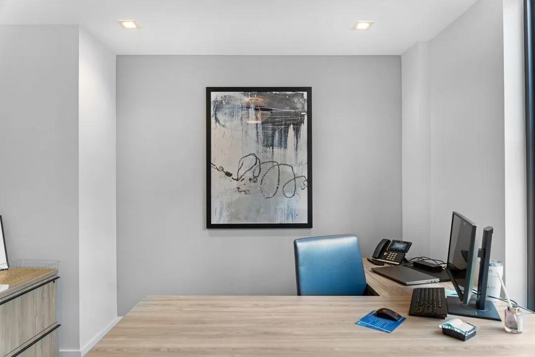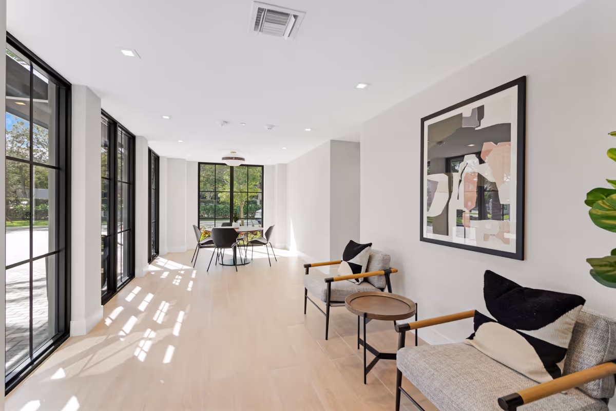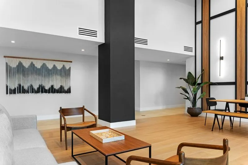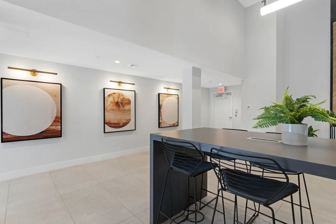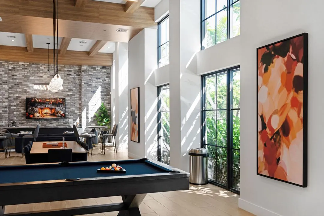 Indiewalls curated an art collection that mirrors the property's elegant, minimalistic, and tropical design. Located in South Florida, this collection features warm, earthy tones and diverse textures. It includes a range of media, such as hand-painted murals and hand-dyed textile art, highlighting the unique touch of each artist. Notable pieces include collaborations with local muralist Orla Ananda, resulting in two significant murals that reflect the local ambiance. Scott Troxel's "Eclipse," a wooden wall sculpture, skillfully blends warm wood shades with sleek ivory elements. Lauren Williams' "Blue Ridge" contributes texture and softness, utilizing fabric to enhance the verticality of the space. Completing the collection are two large abstract pieces by Patricia Vargas in the Club Room and a series of vibrant prints by Dan Hobday for the office areas, all embodying the sophisticated spirit of Leena.
