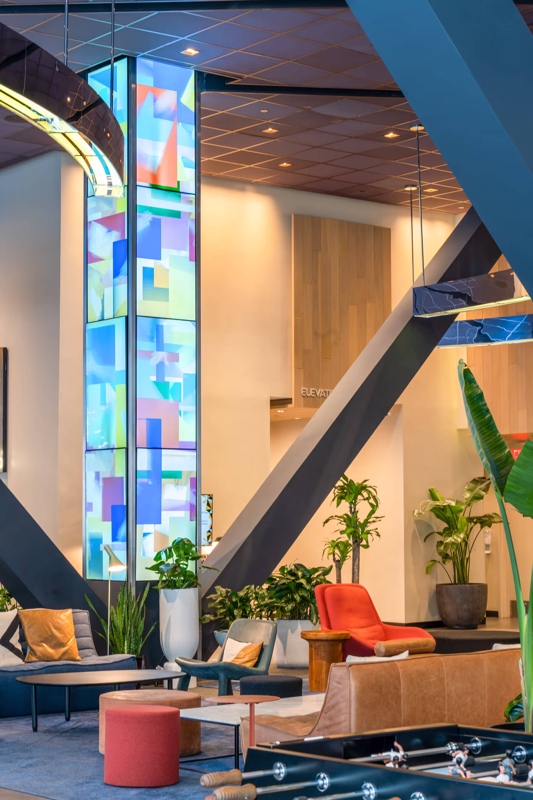 Massive columns in the hotel's lounge act as canvases for video art by artist Erik Winkowski. Visitors entering the room are mesmerized by the creative use of technology and color in Winkowski's pieces.