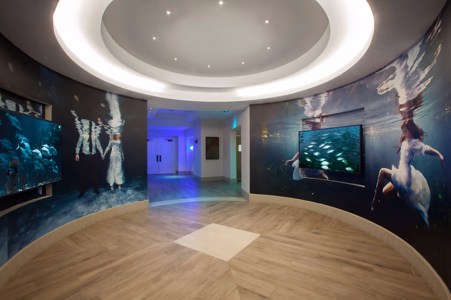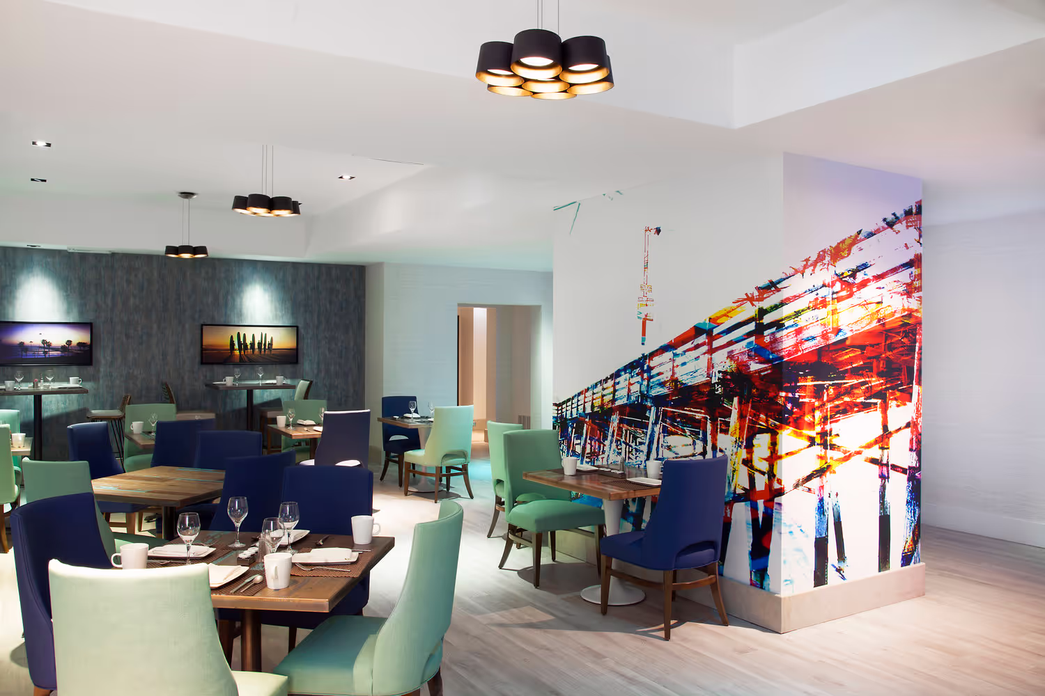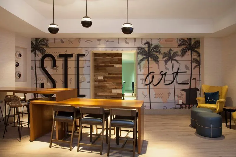 For this project, we commissioned a number of artists to create unique, one of a kind murals for the public spaces. These works embody the fun, colorful So-Cal chic vibe with imagery of palm trees, beaches, the local pier - everything you could desire for a laid back weekend in Newport Beach!
