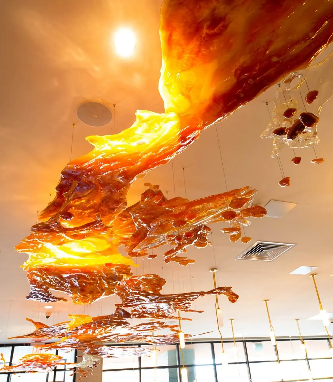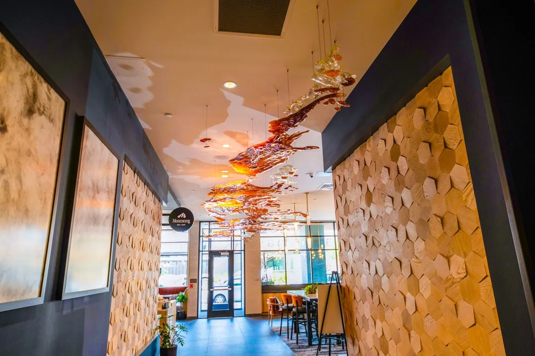 Look up as you enter the bar and you’ll see Ashley Nardone’s stunning installation, "Smooth Finish." Inspired by the way whiskey is poured, this ceiling piece uses glass bubbles to mimic the tiny drops of liquid, and as the light shifts, you’ll see colors change just like the hues of bourbon. It’s designed to make you stop, look up, and take in the moment.